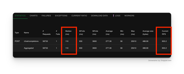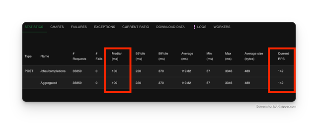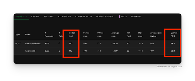 Adding 1 instance, will double the RPS and maintain the 100ms-110ms median latency.