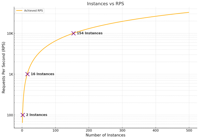 100ms - For 10,000 RPS: Need ~154 instances @ 95.7% efficiency,