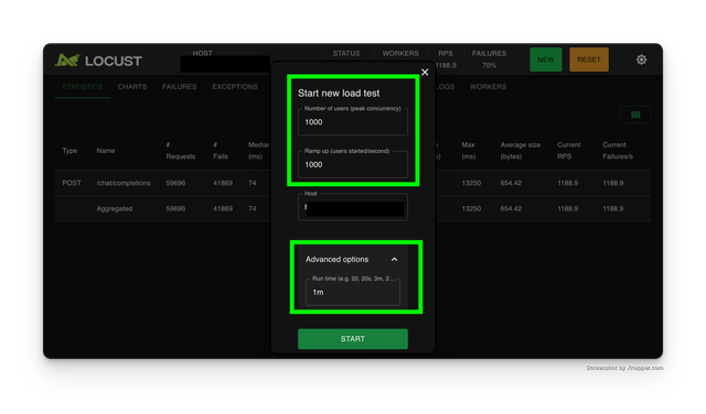 Head to the locust UI on http://0.0.0.0:8089 and use the following settings